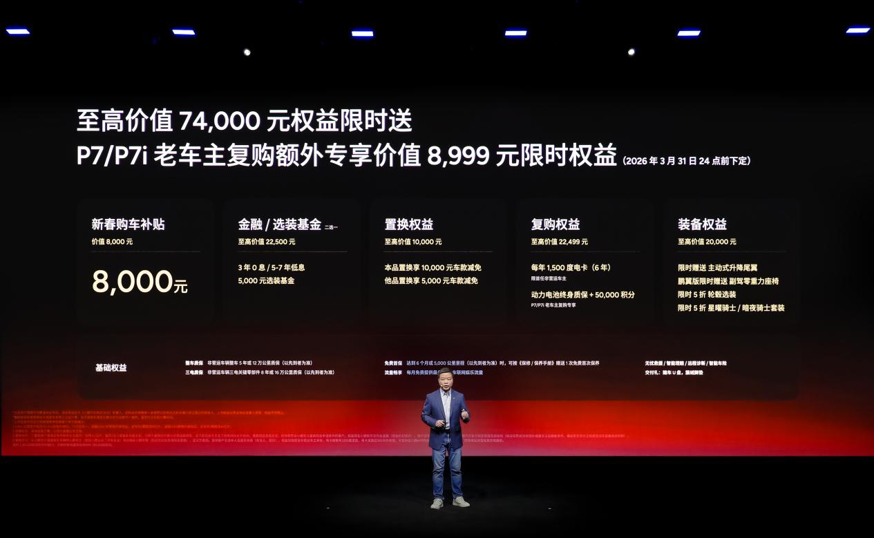即日起至2026年3月31日24点前下定小鹏P7,用户可享受至高74000元的配置限时送权益,包括价值8000元的新春购车补贴,并可二选一享受5000元选装基金,或3年0息/5-7年低息的金融购车权益;同时,置换用户可获至高10000元置换权益,复购用户可享至高22499元复购权益。在外观方面,小鹏提供了至高价值20000元的装备权益,两款新色套装及轮毂选装的限时半价优惠,主动式升降尾翼限时赠送,购买鹏翼版车型的朋友还可额外获赠副驾零重力座椅。多重礼遇助力用户轻松开启智能出行生活。