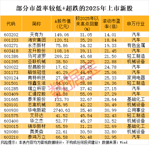 从估值水平来看,据数据宝统计,截至12月5日收盘,回撤幅度超30%的2025年上市新股当中,滚动市盈率低于40倍的有32只。天有为、、3股滚动市盈率不到20倍。