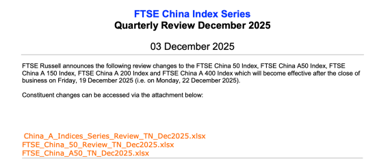 12月3日,宣布对富时中国50指数、富时中国A50指数、富时中国A150指数、富时中国A200指数、富时中国A400指数的审核变更。该变更将于2025年12月19日星期五收盘后生效。