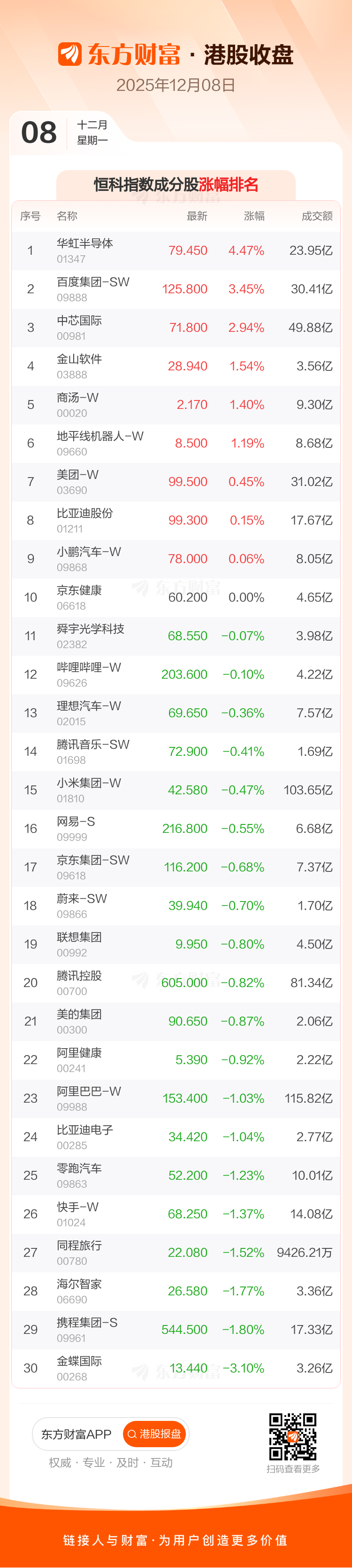 12月8日,恒生指数收报25765.36点,跌319.72点,跌幅1.23%;恒生科技指数收报5662.55点,涨0.09点,涨幅0.0%。恒生指数成分股中、、涨幅居前,、、跌幅靠前。恒生科技指数成分股中、百度集团-SW、中芯国际涨幅居前,、、跌幅靠前。
