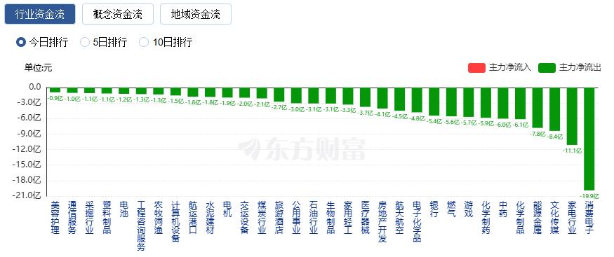 净流出方面,、、等净流出排名靠前,其中消费电子净流出19.89亿元。