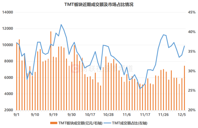 从题材概念上看,作为时下热门科技赛道的TMT板块近日量能数据也有明显增长,其板块今日成交总额7463亿元,创10月31日以来新高,同时其成交额在市场中占比36.38%,为11月27日以来近1周高点。其中,通信板块今日成交额1690亿元,创9月18日以来近3个半月新高,同时,电子、计算机板块成交额也于今日录得不同程度的阶段新高。