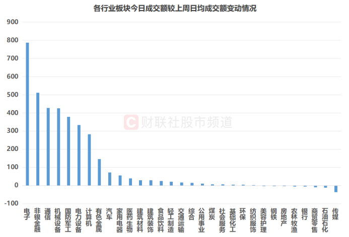 按行业统计,31个申万一级板块中,共有23个板块今日成交额较上周日均成交额有所增长,占比近74.2%。其中,电子、非银金融、通信、机械设备板块热度提升明显,成交额分别增长787亿元、512亿元、428亿元、425亿元。同时,国防、电力设备、计算机等板块成交额也有明显增长,而传媒、石油石化、商贸零售等板块今日成交额则略有缩量。