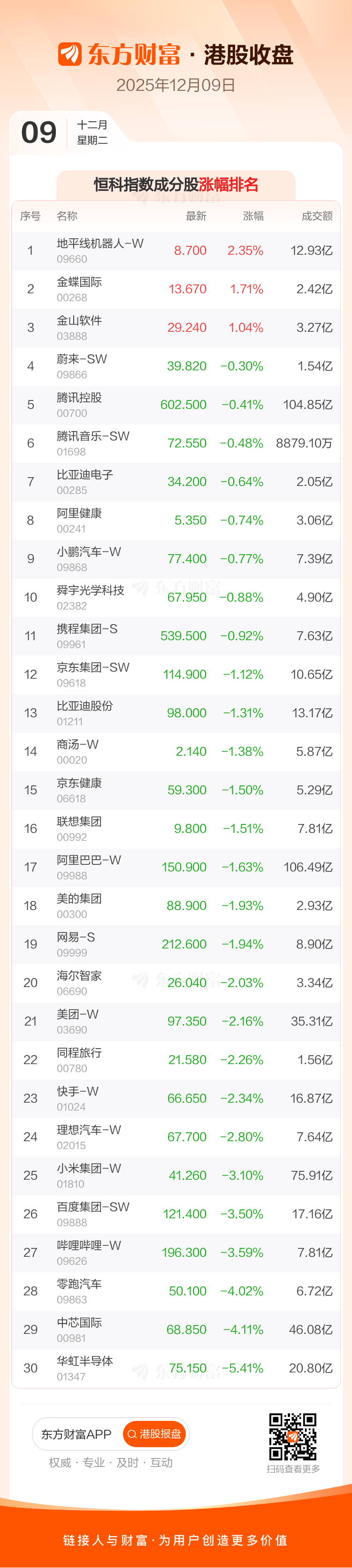 港股12月9日收盘走低,恒生指数收报25434.23点,跌331.13点,跌幅1.29%;恒生科技指数收报5554.68点,跌107.87点,跌幅1.9%。恒生指数成分股中、、涨幅居前,、、跌幅靠前。恒生科技指数成分股中、、涨幅居前,、、跌幅靠前。