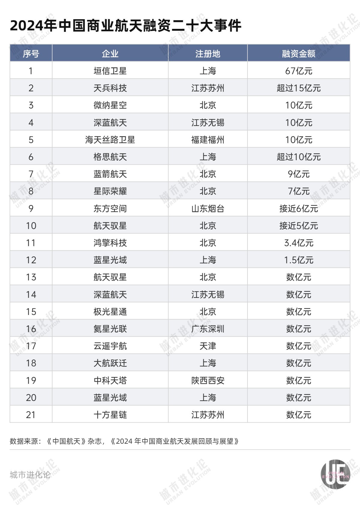 从融资来看,北京、上海等地也是重点区域。今年初,《中国航天》杂志刊发的《2024年中国商业航天发展回顾与展望》披露,2024年我国商业航天领域共发生融资52起,合计披露融资金额150亿元,其中卫星运营、火箭制造和卫星制造领域融资金额分别占43%、30%、16%。