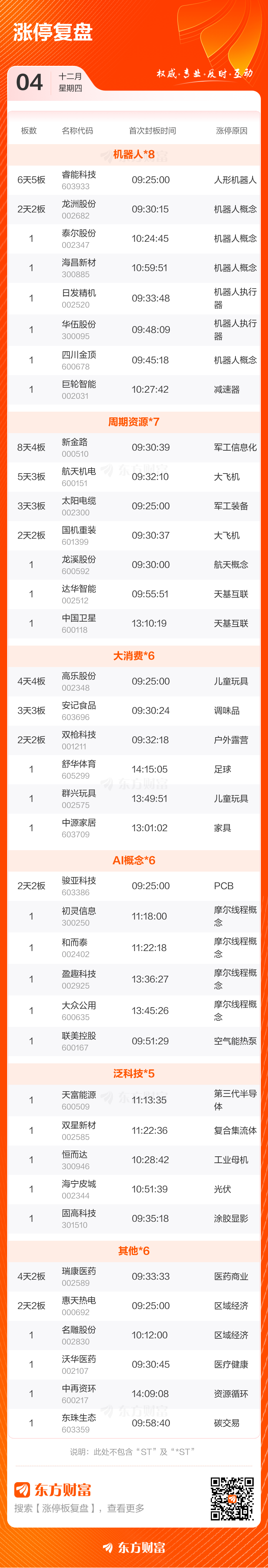 12月4日涨停复盘:39只股涨停 睿能科技6天5板