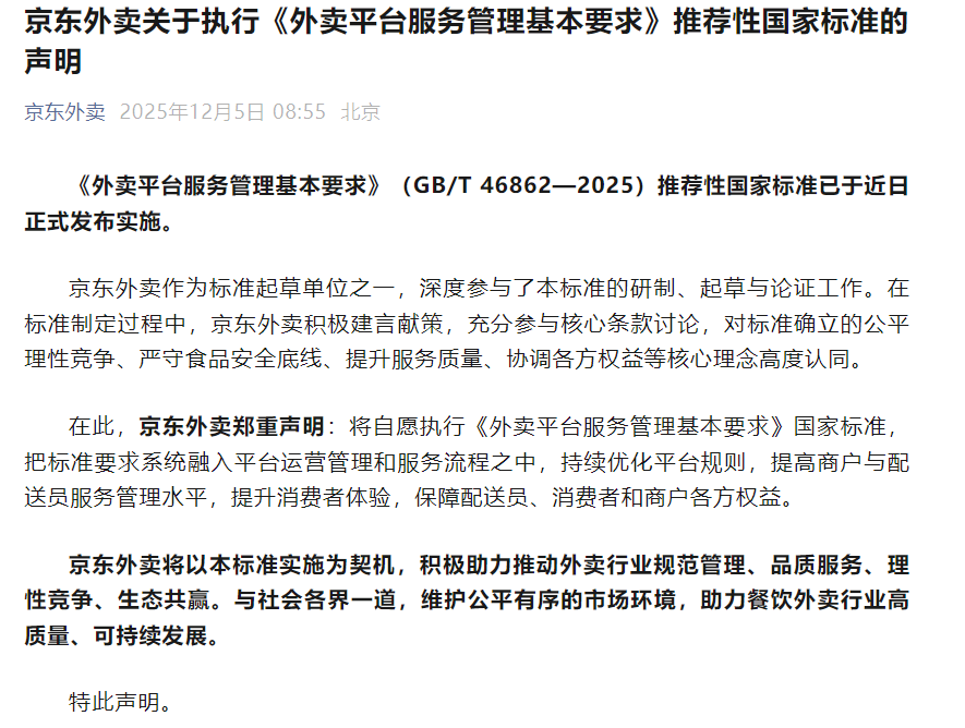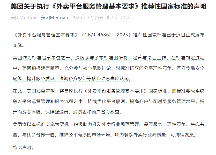 财联社12月5日讯,近日淘宝闪购、美团、外卖分别发表声明:公司将自愿执行《外卖平台服务管理基本要求》国家标准,把标准要求系统融入平台运营管理和服务流程之中,持续优化平台规则,提高商户与配送员服务管理水平,提升消费者体验,保障配送员、消费者和商户各方权益。