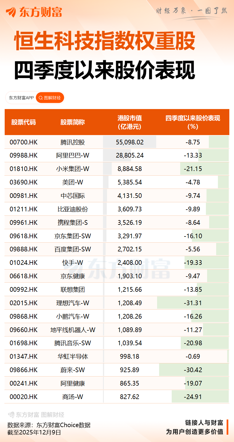 从市场结构来看,港股市场新消费概念股今天再度集体走低,、跌超4%,、、跌超3%,、跌超2%。芯片股午后走低,跌近5%,、等跟跌。知名港股中,、、、华虹半导体、、等跌幅都比较大。