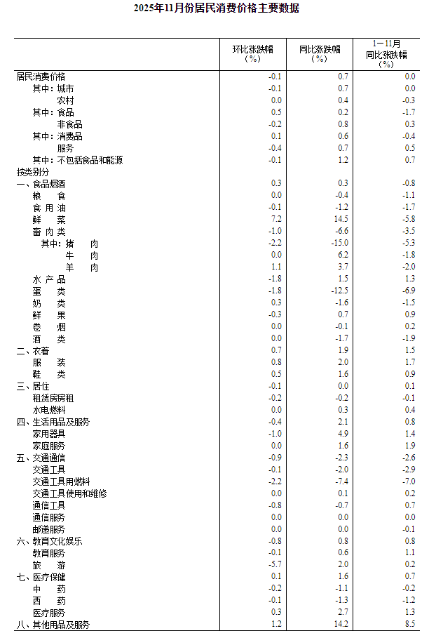 2025年11月份,全国居民消费价格同比上涨0.7%。其中,城市上涨0.7%,农村上涨0.4%;食品价格上涨0.2%,非食品价格上涨0.8%;消费品价格上涨0.6%,服务价格上涨0.7%。1—11月平均,全国居民消费价格与上年同期持平。
