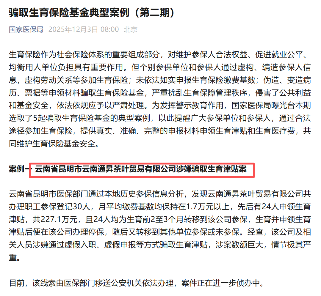 日前,国家医保局公布骗取生育保险基金典型案例(第二期),其中,首个案例为“云南省昆明市云南通昇茶叶贸易有限公司涉嫌骗取生育津贴案”,即为此次登上热搜首位的案件。