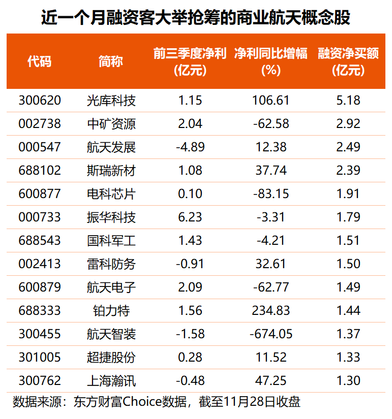 值得注意的是,受持续利好消息催化,商业航天板块近期持续走高。东方财富Choice数据显示,近一个月以来,已有多只概念股获杠杆资金加仓。