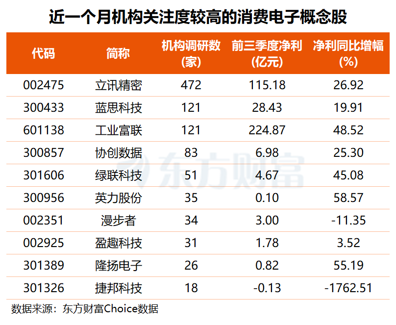 Choice数据显示,近一个月以来,多只消费电子概念股获机构密集调研,其中,龙头股获472家机构集中调研,、均获121家机构调研。