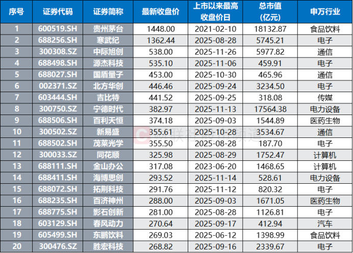 目前,以1448元的价格仍位居A股股价榜首,寒武纪次之,股价报收于1362.44元。此外,、、、、、、、等股股价也居前。值得注意的是,在股价前20只标的中,共有18只个股在今年录得历史最高收盘价,若以月份来统计,其在今年8月、9月、11月期间收盘价历史新高较多。