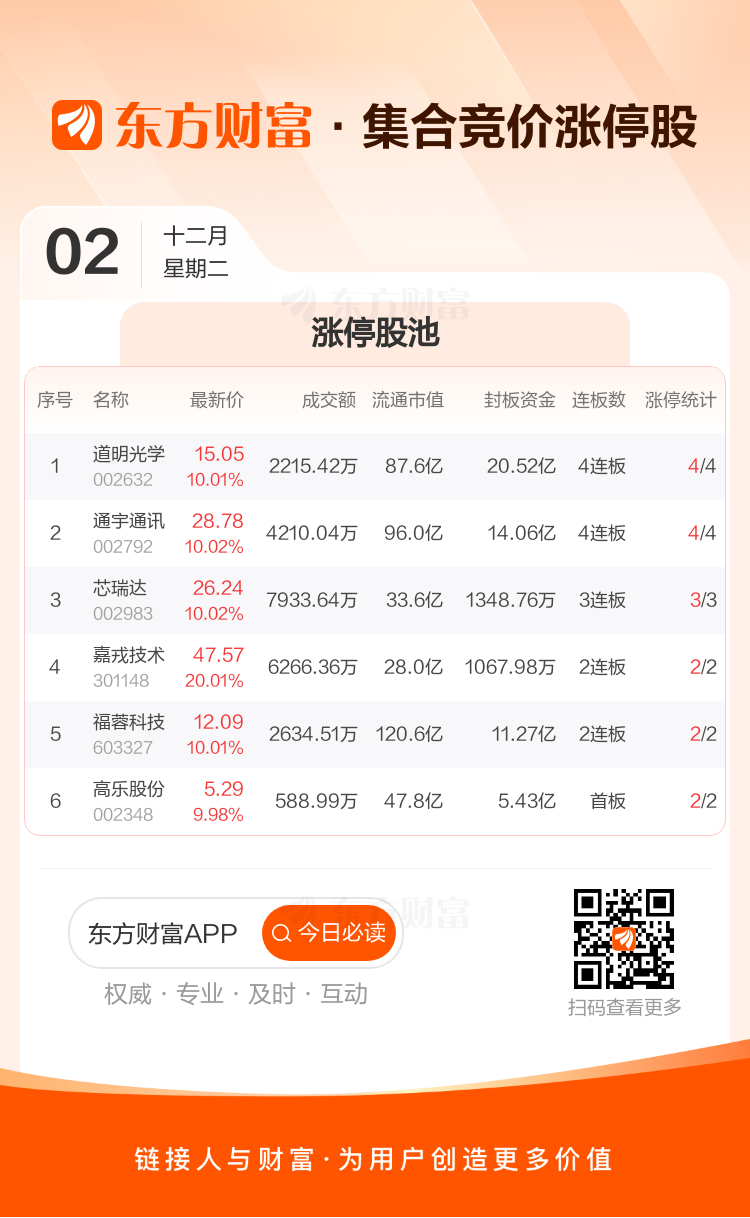 12月2日集合竞价:道明光学、通宇通讯4连板