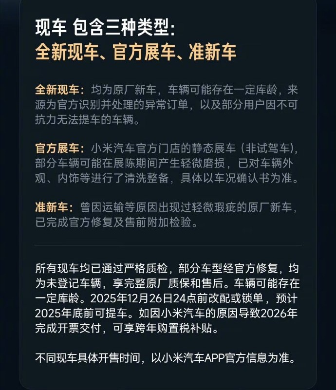 按照小米汽车官方解释,所谓“现车”包含三种类型:全新现车、官方展车和准新车。