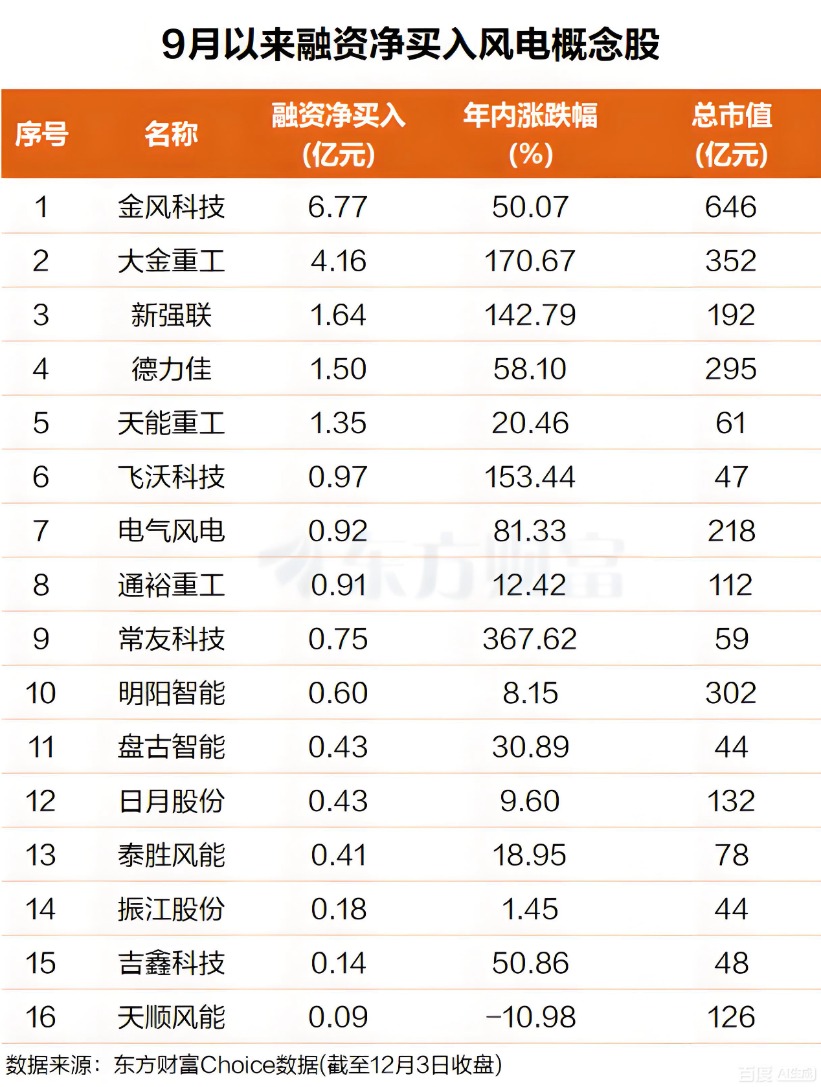 Choice数据显示,自9月以来,杠杆资金净买入16只风电概念股。具体来看,排名第一,融资净买额超近7亿元;大金重工排名第二,融资净买额超4亿元。