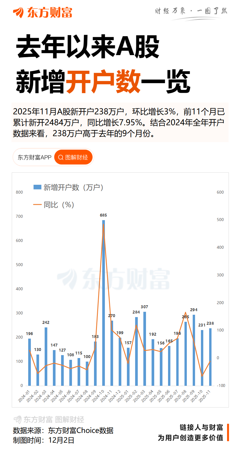 最新数据显示,11月A股新开户238万户,环比10月231万户增长3%,环比去年11月新增270万户下降12%。至此,仅剩1月收官,2025年已累计新开2484万户,较2024年同期增长8%。