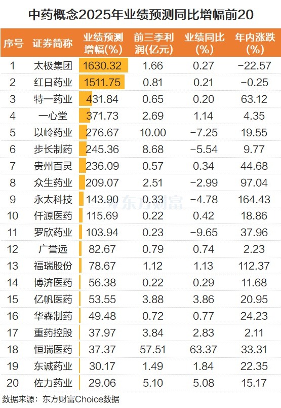 而从机构预测的2025年全年业绩来看,股中有11家公司业绩或将翻倍。高居榜首,2025年业绩预测同比增长1630%。紧随其后,业绩预测同比增长1512%。特一药业、、、、等业绩预测增幅也靠前。