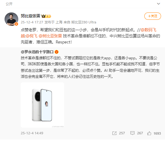 副总裁、努比亚旗舰产品总经理张雷转发罗永浩微博表示,希望这是AI手机时代的新起点。