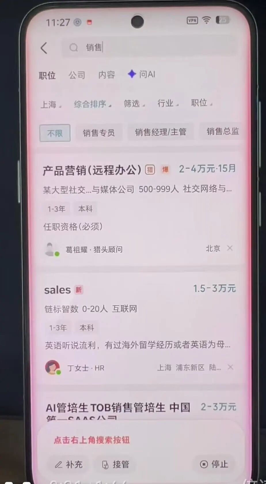 “还有个很实用的功能,在招聘软件上自动搜索岗位并投递简历。”周先生说,这个过程中使用者能解放双手,同步处理其他事务。他进一步解释投递简历的指令流程,打开招聘软件后,在搜索框选定心仪岗位,点击进入详情页再发送招呼语,“10分钟大概发了30条求职简历。”不过周先生也提到,指令执行速度比手动操作慢一些,单个步骤需要2到3秒,而人工操作全程可能3秒就能完成。