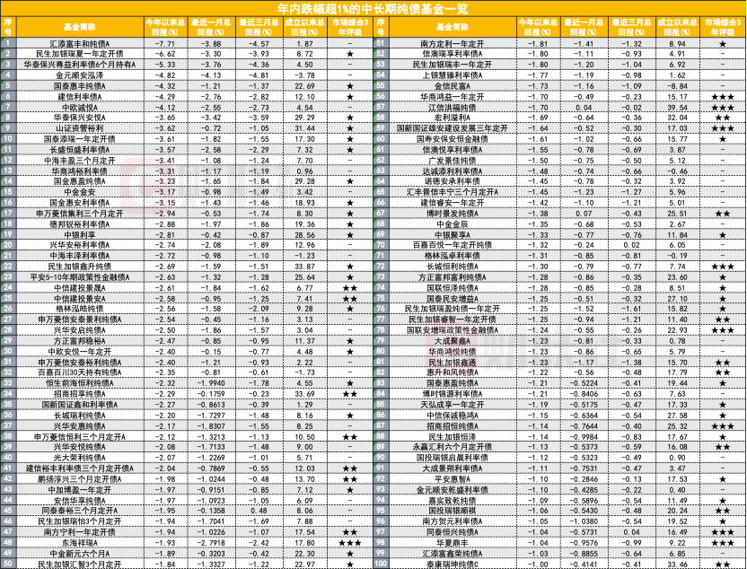 此外,金元顺安泓泽、国泰惠丰纯债、建信利率债、建信利率债等基金年内跌幅也超过4%。
