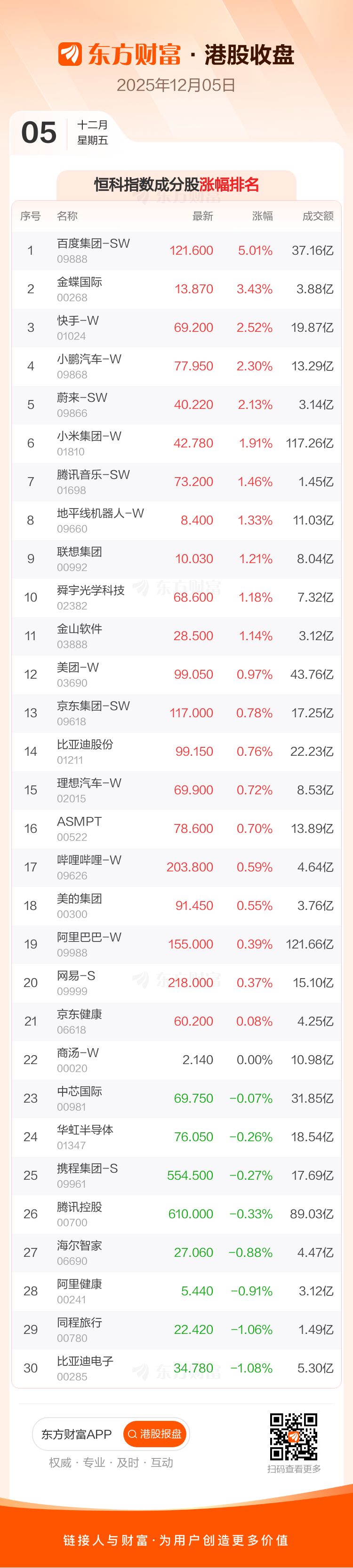 港股12月5日收盘走高,恒生指数收报26085.08点,涨149.18点,涨幅0.58%;恒生科技指数收报5662.46点,涨47.03点,涨幅0.84%。恒生指数成分股中、、涨幅居前,、、跌幅靠前。恒生科技指数成分股中百度集团-SW、、涨幅居前,、、跌幅靠前。
