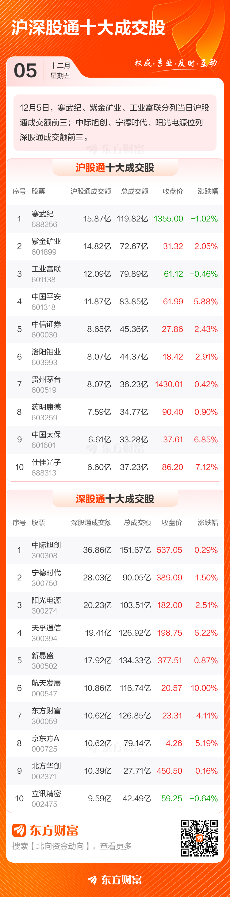 交易所最新数据显示,12月5日北向资金共成交1926.85亿元,占两市总成交额的11.17%。