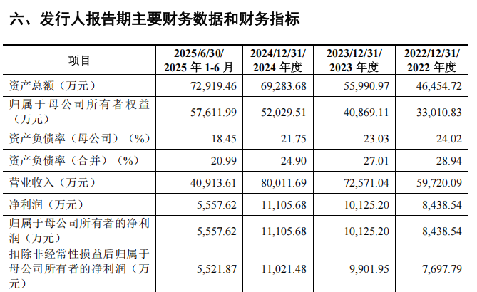 2022年至2024年及2025年上半年,天溯计量的营业收入分别为5.97亿元、7.26亿元、8.00亿元及4.09亿元,归母净利润分别为8438.54万元、1.01亿元、1.11亿元及5557.62万元。
