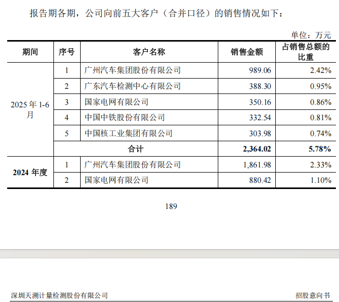 2025年上半年,天溯计量的前五大客户分别是广州汽车集团股份有限公司、广东汽车检测中心有限公司、国家电网有限公司、股份有限公司、中国核工业集团有限公司。