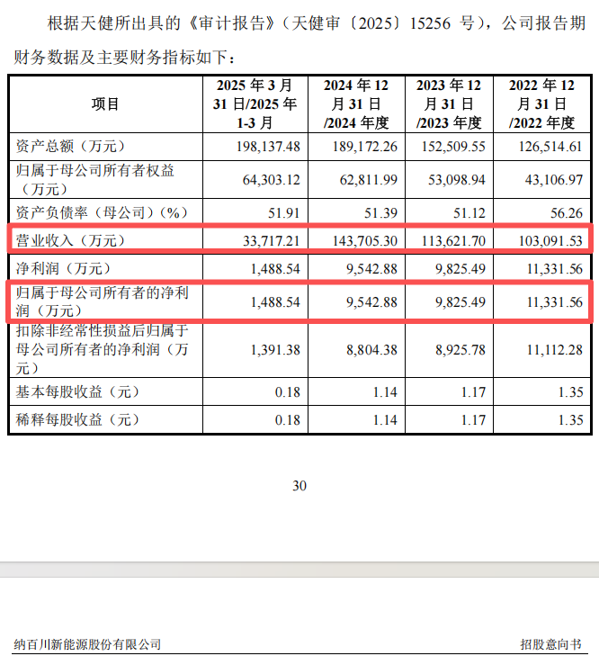 2022年至2024年及2025年第一季度,纳百川的营业收入分别为10.31亿元、11.36亿元、14.37亿元及3.37亿元,归母净利润分别为1.13亿元、9825.49万元、9542.88万元及1488.54万元。