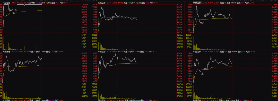 行业板块方面,被誉为“牛市旗手”的券商板块爆发,板块涨幅超过2%,触及涨停,、、等跟涨。
