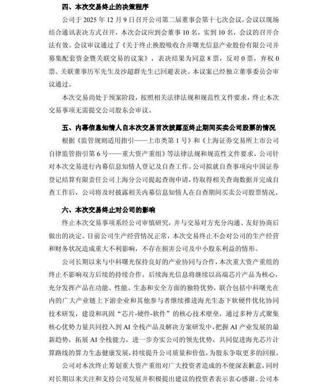 晚间公告,公司于2025年12月9日召开公司第二届董事会第十七次会议审议通过了《关于终止换股吸收合并曙光信息产业股份有限公司并募集配套资金暨关联交易的议案》,同意公司终止通过向曙光信息产业股份有限公司(简称“”)全体A股换股股东发行A股股票的方式换股吸收合并中科曙光并募集配套资金,并授权公司管理层办理本次终止相关事宜。