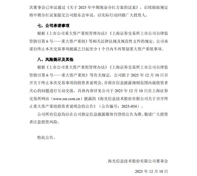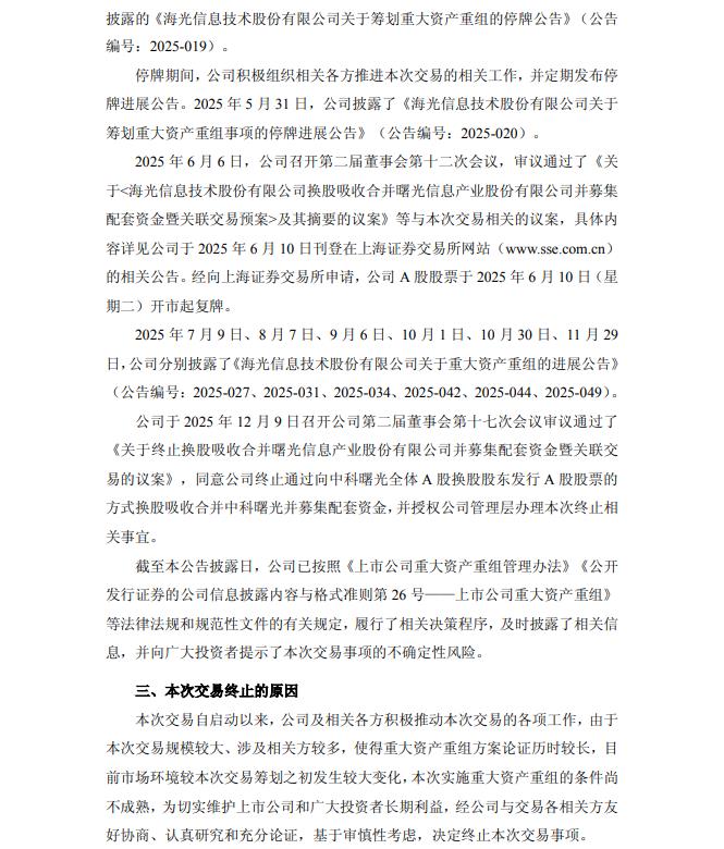 海光信息表示,由于本次交易规模较大、涉及相关方较多,使得重大资产重组方案论证历时较长,目前市场环境较本次交易筹划之初发生较大变化,本次实施重大资产重组的条件尚不成熟,为切实维护上市公司和广大投资者长期利益,经公司与交易各相关方友好协商、认真研究和充分论证,基于审慎性考虑,决定终止本次交易事项。